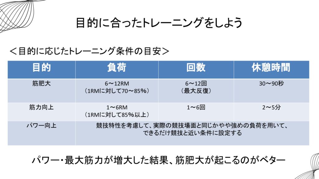 - 目的に応じた負荷と回数でトレーニングを実施する